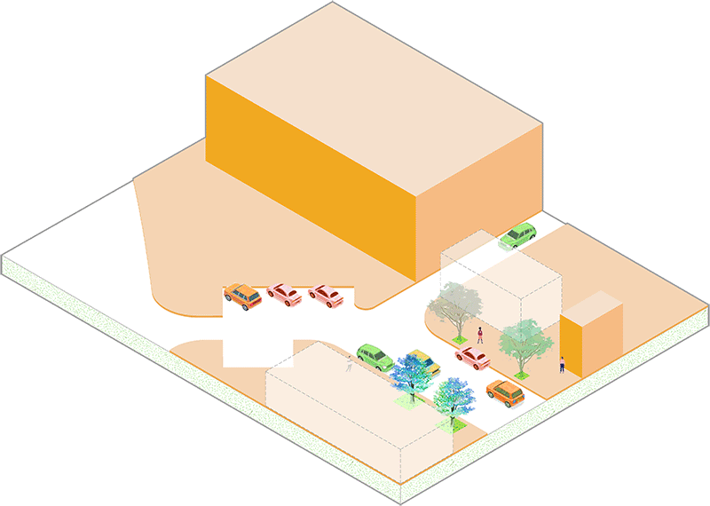 Proposed: Integrating pervious paving and adding trees and rain gardens to increase tree canopy and better utilize the space.