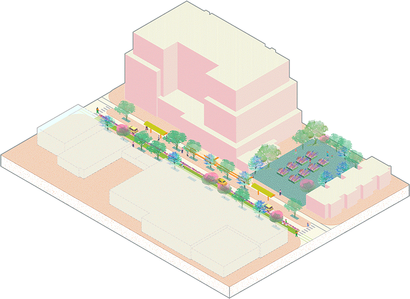 The client’s vision for the project is to create a “Green Metropolis” by bringing nature into urban spaces, protecting existing small businesses, and establishing a plan for green infrastructure while involving the community. After setting up critical success factors and project dilemma, the team established a thesis for the project that included identifying priority areas for re-design, creating a series of typologies to address needs, re-designing Boxyard Park, and creating a series of “green ribbons” to connect the neighborhood and community amenities.