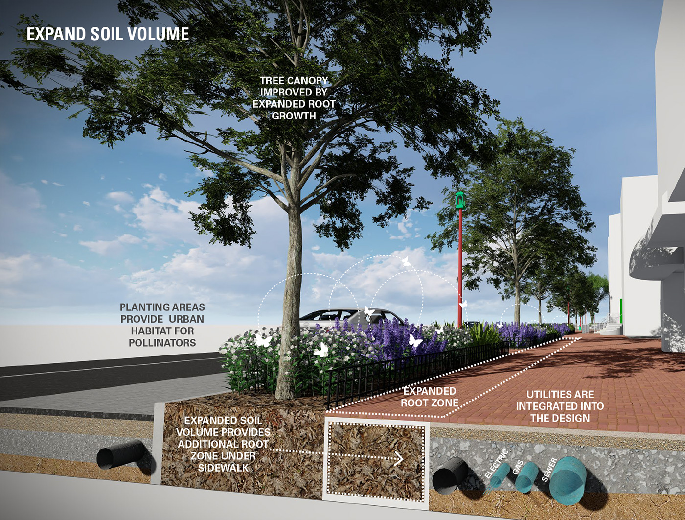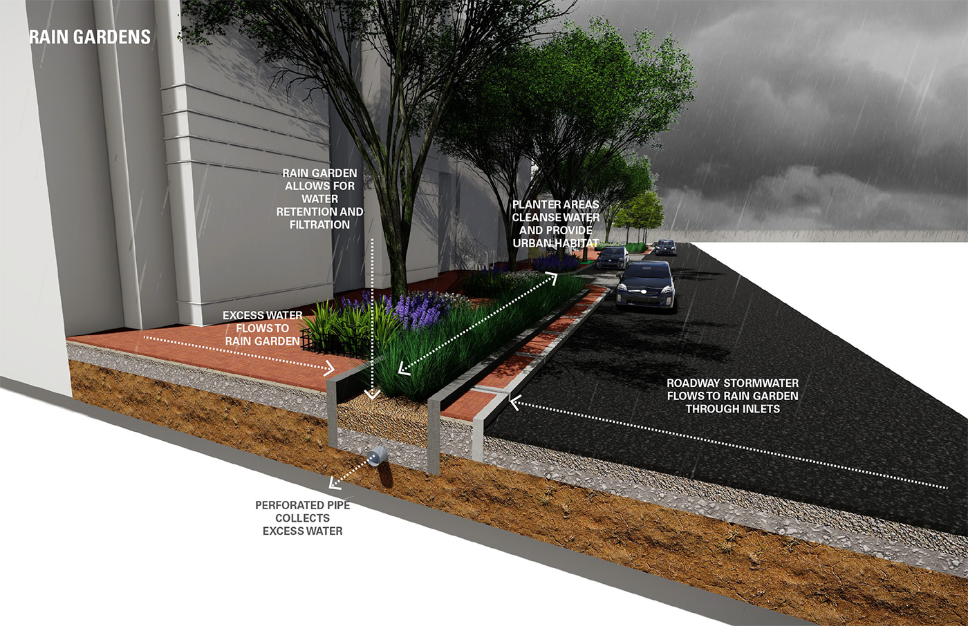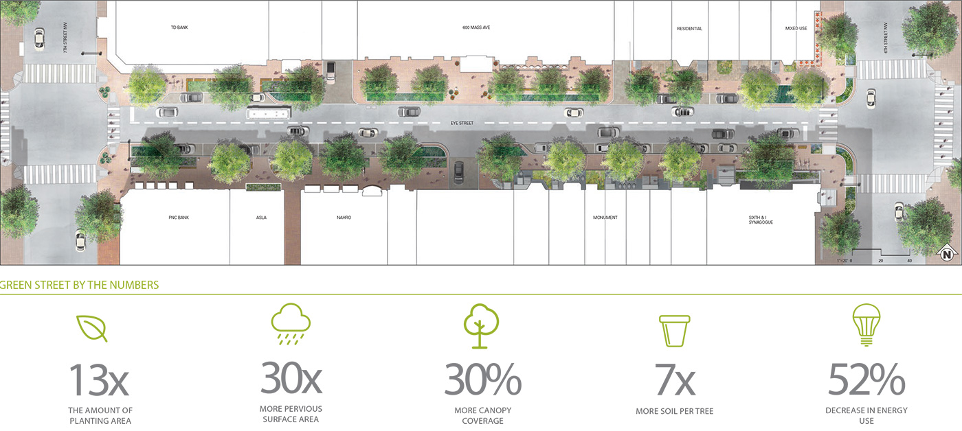 Chinatown Green Street Demonstration Project is a one block “laboratory” study area in Washington D.C. The purpose of the project is not only to renovate the streetscape in front of The Center for Landscape Architecture and demonstrate the role of the landscape architect in creating smarter and greener streetscapes, but also to examine the potential ecosystem problems at the site, apply innovative solutions to this “laboratory,” and measure the impacts of these solutions in order to replicate these as best practices on other streetscapes. Ultimately, the intent of this streetscape is to; (1) capture and filter rainwater to reduce the impact on the sewer system, (2) reduce urban heat island effect by maximizing canopy coverage and (3) provide safety and security for pedestrians in a comfortable environment.