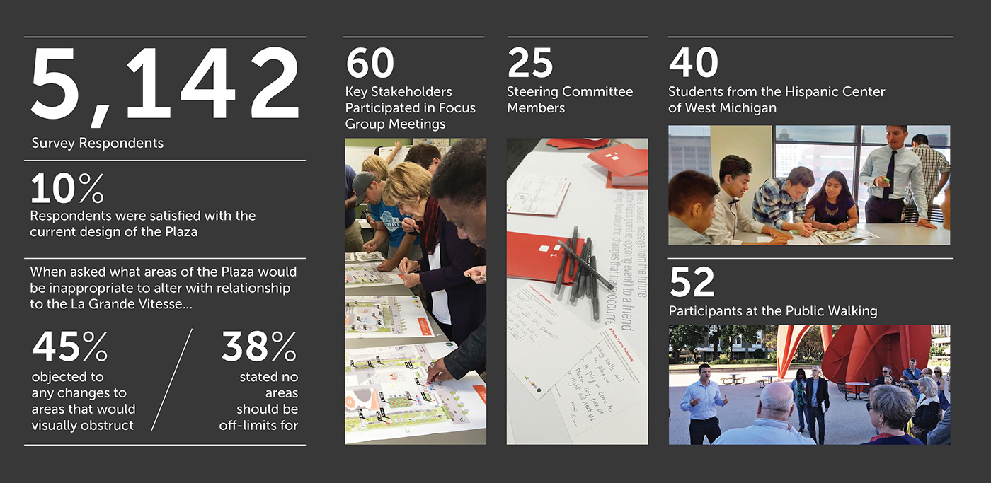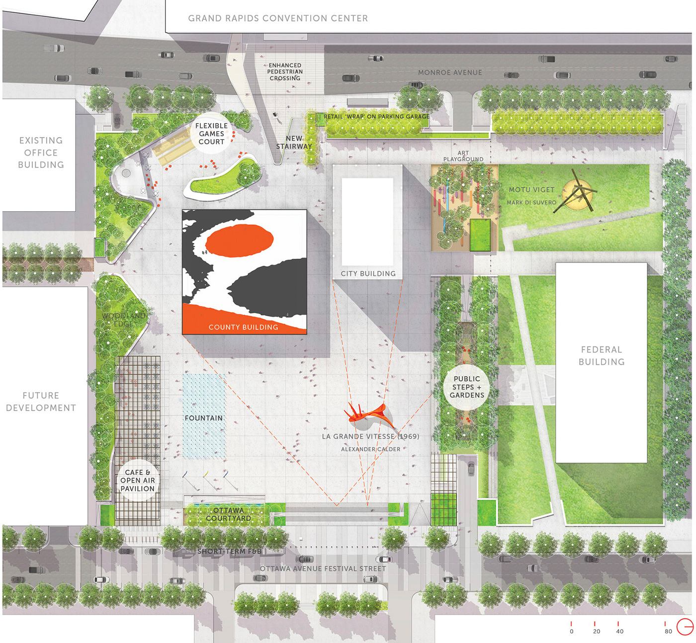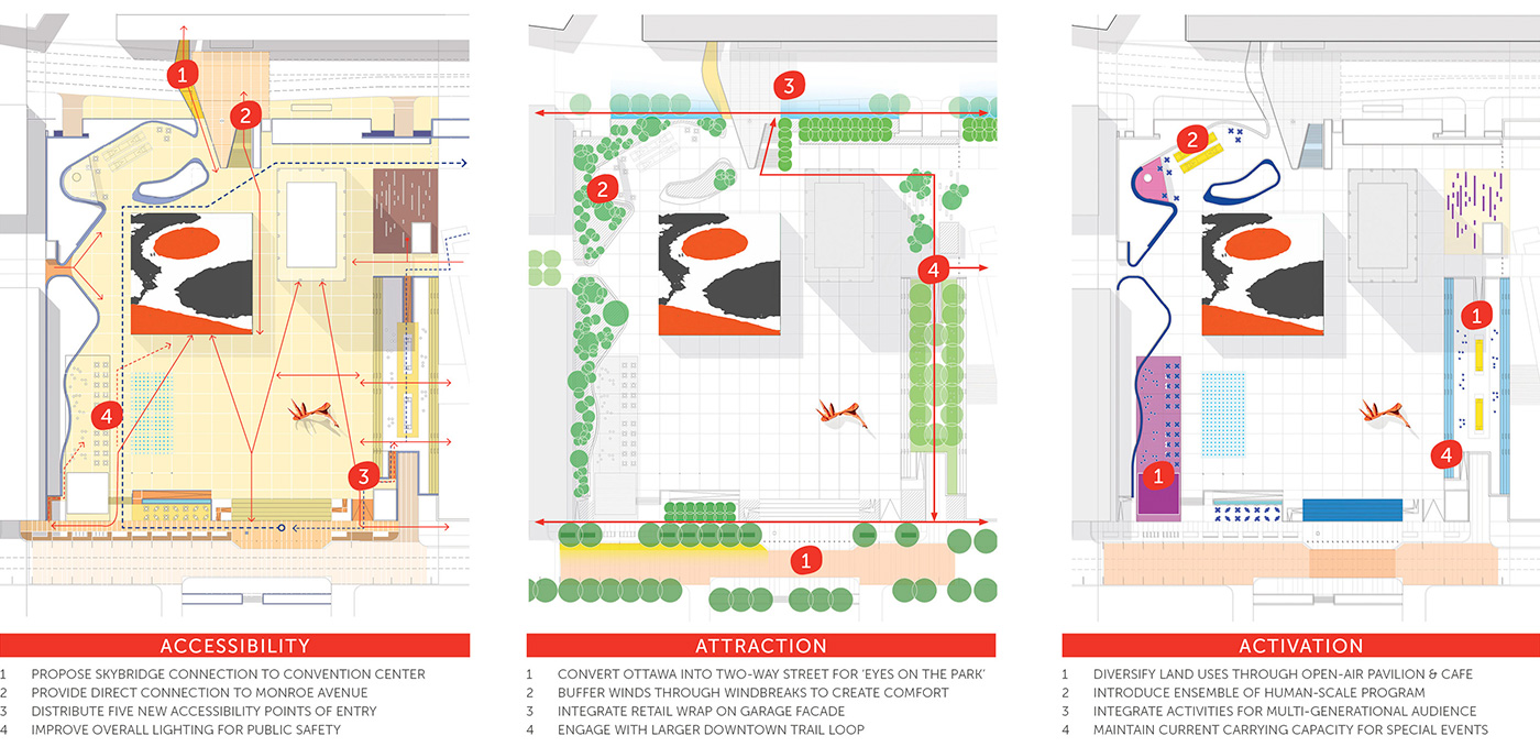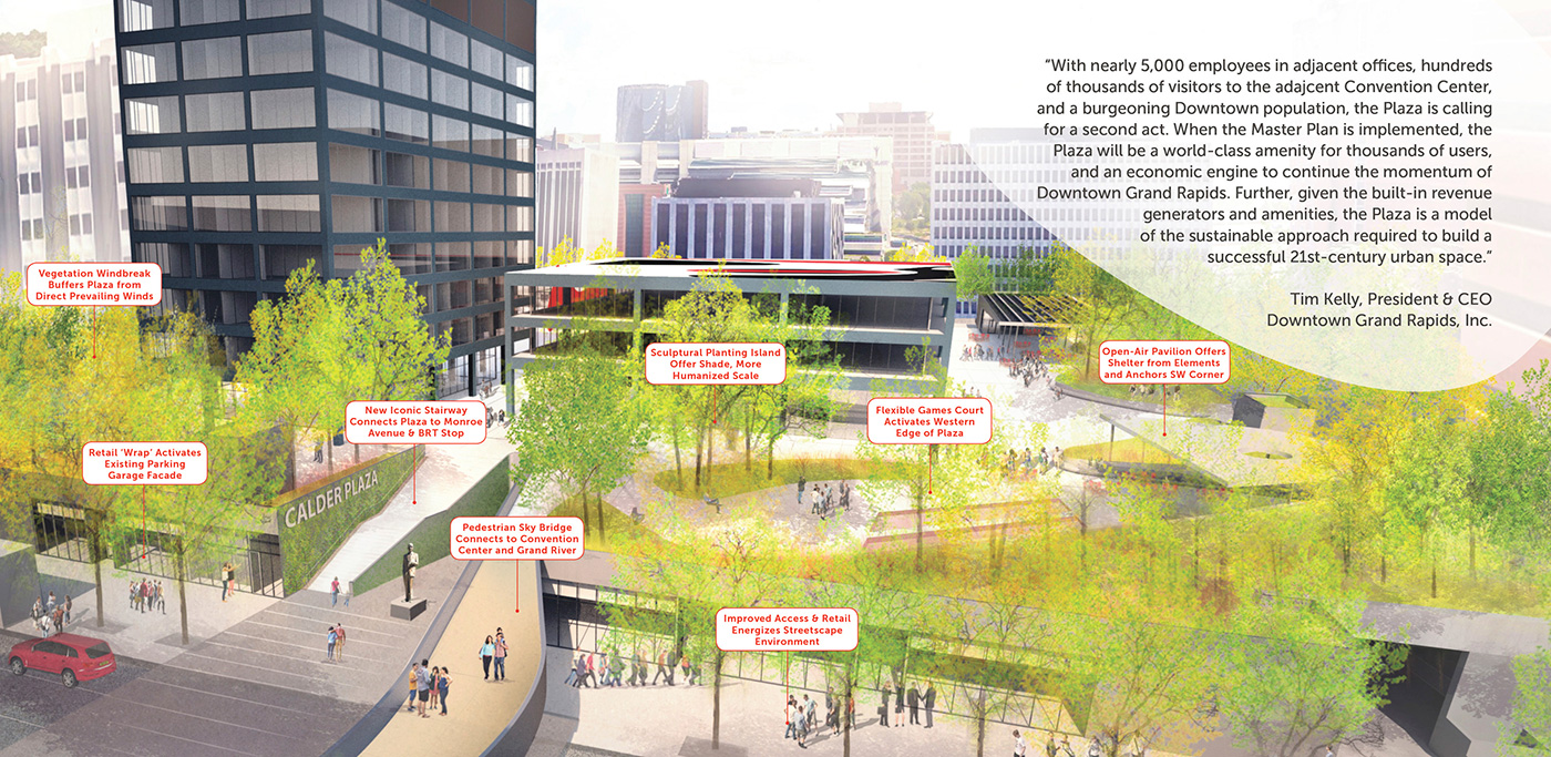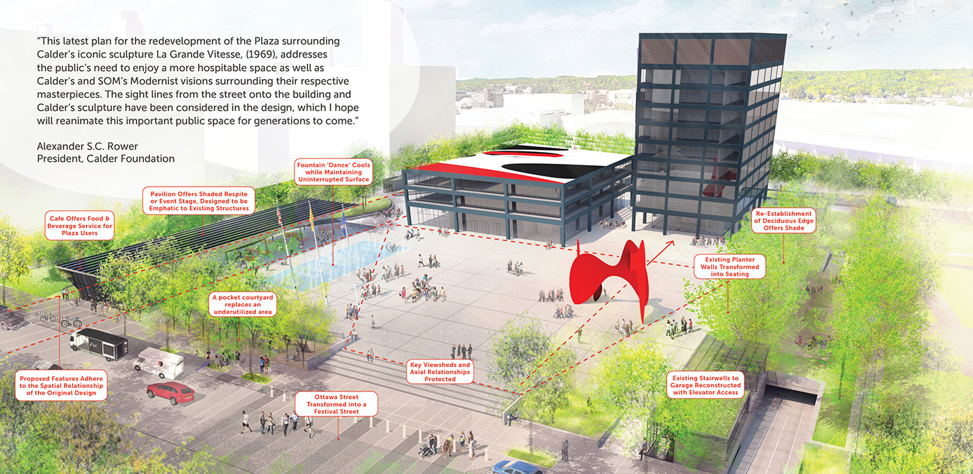 In 1969, Calder Plaza emerged from the ideals of late-modernism as a signature of civic space in Grand Rapids, Michigan. Punctuated by Calder’s La Grande Vitesse, the design created a national paradigm shift in how public art and urban space interact as one. However, due to social and economic changes, the plaza today remains lifeless and empty. In 2016, a community survey revealed only one in ten citizens were satisfied with its current state, though recommendations were broad. Recognizing historical significance and emerging needs, Design Workshop and Marlon Blackwell Architects set forth a visionary, inclusive, community-wide planning process that built consensus towards a plan that adapts to contemporary conditions while honoring the integrity of internationally recognized art.