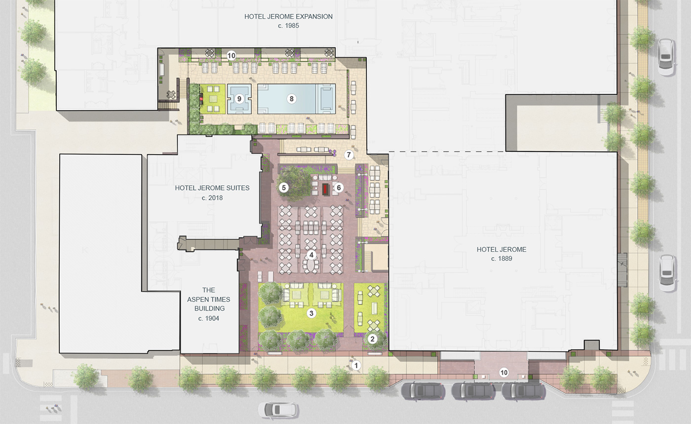 The historic Hotel Jerome, built in 1889, is a centerpiece of Aspen and an invaluable part of its Victorian charm. A model of the power landscape architecture has to reflect and encourage the stewardship of historical properties, this project returned an iconic courtyard to prominence. In recent decades, the courtyard of this beloved 19th-century Victorian hotel had fallen into disrepair- physically inaccessible, visually tired, and disconnected from its iconic history. In concert with the rehabilitation of an adjacent and equally historic property, a new courtyard design transforms the setting into a trio of distinct programmed, yet flexible spaces that engages new adjacencies, celebrates its cultural heritage and revives its authentic character and revered history as a beloved community legacy.