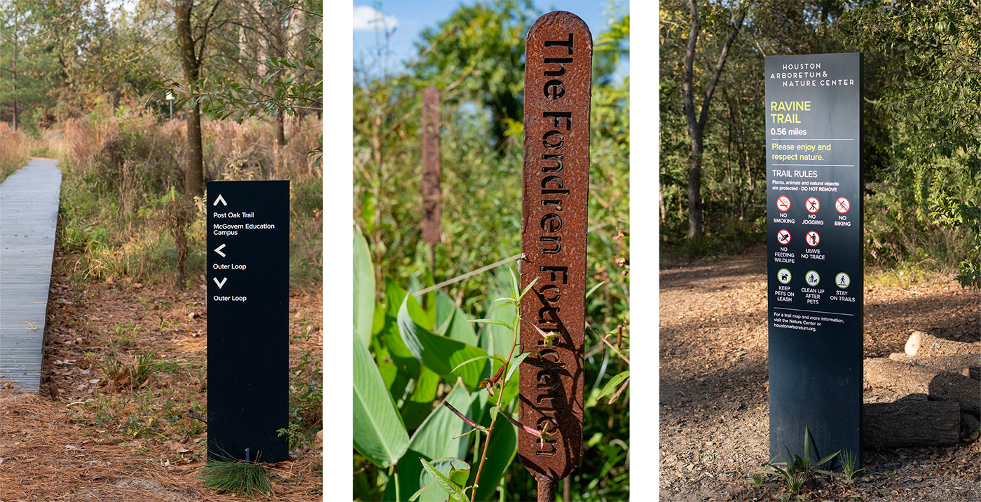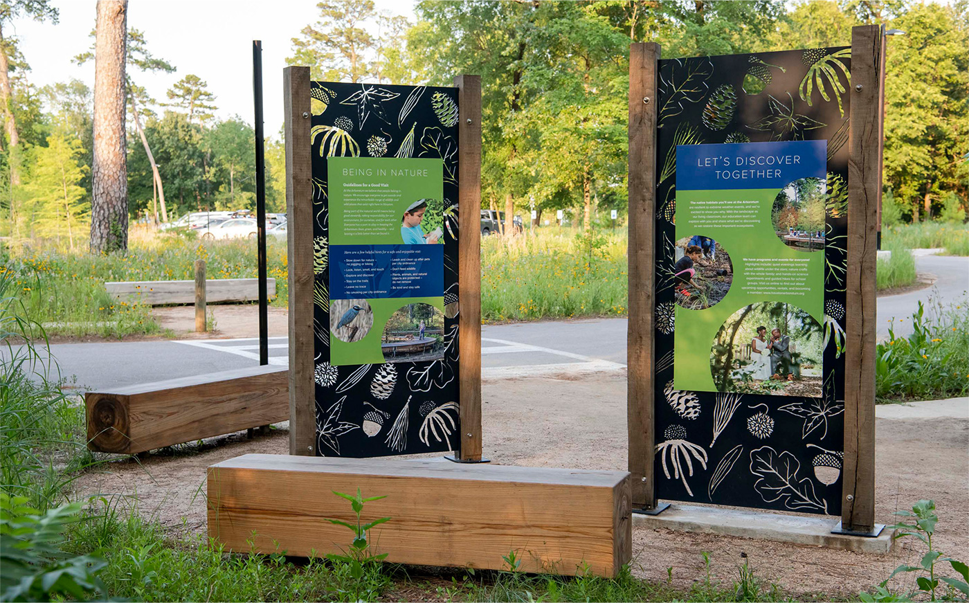 Design Workshop teamed with Leslie Elkins and Main Street to enliven the Houston Arboretum, where environmental graphic design played an integral role. Visitors are greeted by an iconic wall with four artist-designed stainless-steel panels, depicting each of the Arboretum's distinct landscape types. Wayfinding signage aids navigation, while additional signs educate visitors on local flora and fauna. The boardwalk features circular steel inlays that recognize donors, all contributing to a more engaging destination.