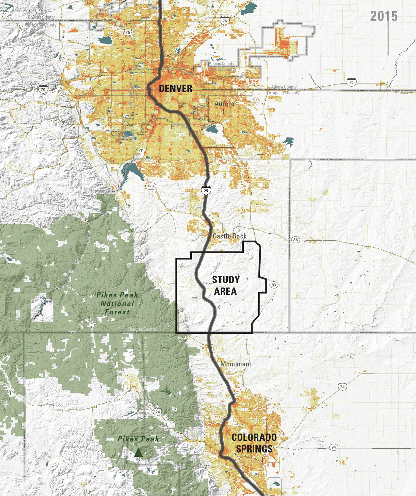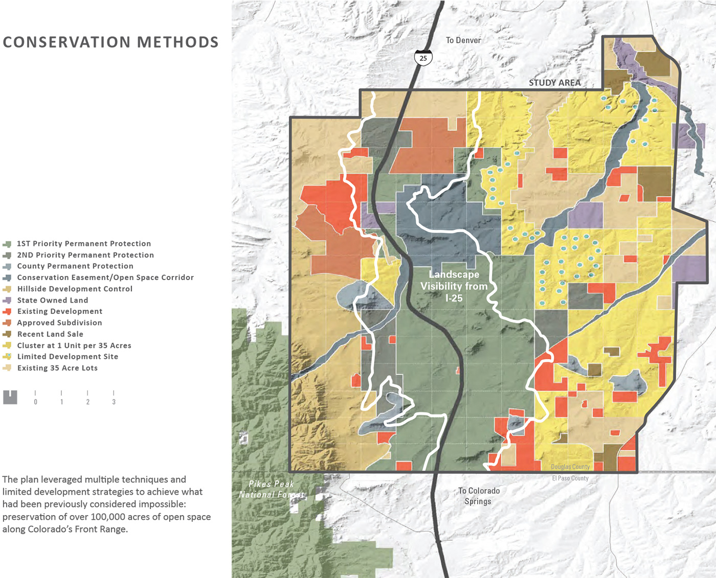 Over 73,000 vehicles travel the Front Range corridor between Colorado Springs and Denver on any given day. This area is growing fast. Population is increasing at a clip of 1,000 per-month and construction continues to change the skyline. Unrelenting sprawl is depleting valuable open space, wildlife habitat and scenic views. Doubling land values have rendered every acre within the corridor vulnerable to development. South of Castle Rock, sweeping views of the mountains emerge amidst a pristine foreground of rolling grasslands, mesas and historic ranches. This unique 17-mile stretch of Interstate 25, approximately 32,000 acres, lies undeveloped following the implementation of the I-25 Conservation Corridor Master Plan, the result of a strong strategic vision coupled with unprecedented cooperation among conservation organizations, government entities and private landowners.