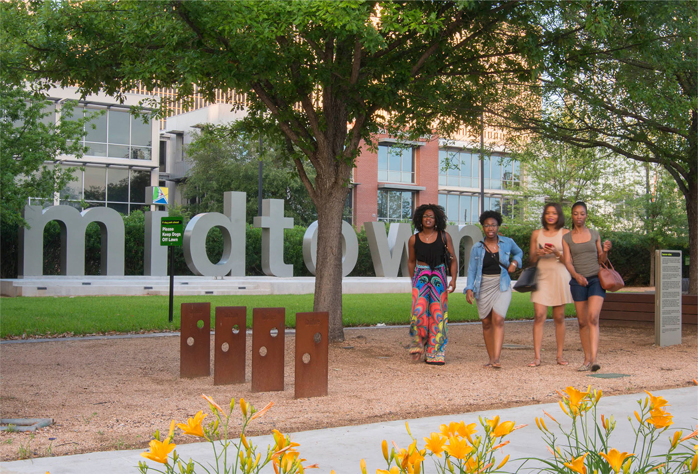 Design Workshop and Midtown Houston have grown together over the last decade. Along with our award-winning parks and streetscapes, we have also developed and designed a comprehensive signage plan for the district. Using the district’s branding palette and guidelines as visual parameters, we created a uniform signage system that works across all applications and includes street signs, educational signs, and seasonal rotating banners that hang throughout the district. Implementing our comprehensive set of guidelines for retail, residential, and commercial spaces has allowed the Midtown Redevelopment Authority (MRA) to efficiently design and fabricate new signs as the district grows and evolves. The result is a distinct sense of place and a comfortable and welcoming environment to locals and visitors alike.