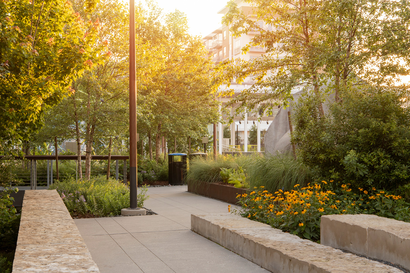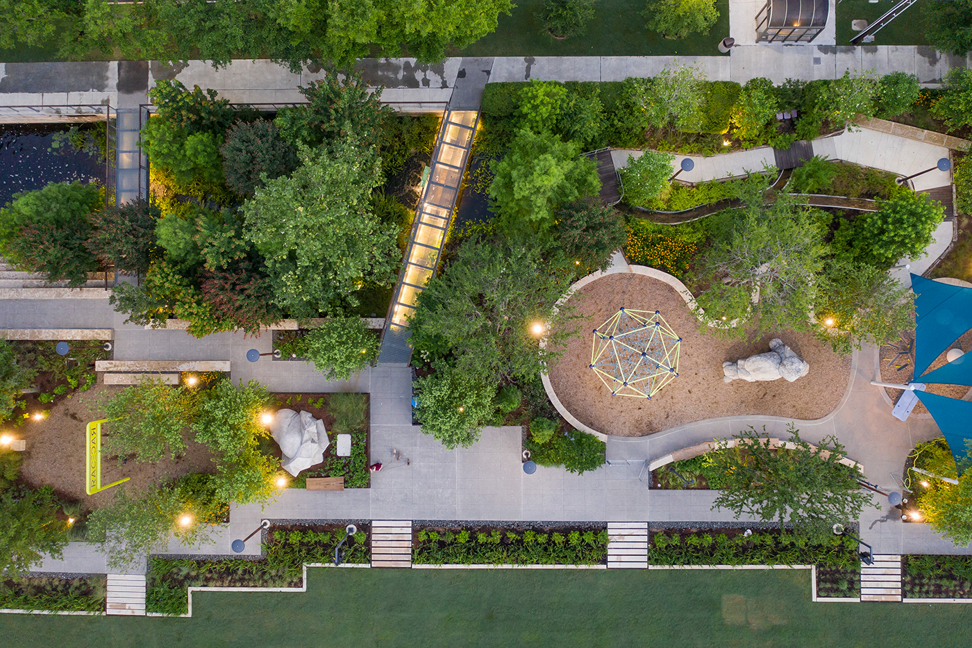 Today Midtown is more walkable, sustainable and connected. With the recent completion of Midtown Park, the once under-used lawn is now the three-acre centerpiece of the larger park system, activated with a performance pavilion, trails, marketplace, two restaurants, an arts garden, dog park and social game courts. Bayou-inspired water features bring nature to the city to provide respite and sustainable water management – all built on top of a public underground parking garage. Midtown Park is an early demonstration project for the ongoing development of a greener, more walkable Houston that proves that high-quality public spaces are a crucial ingredient for successful, livable cities.