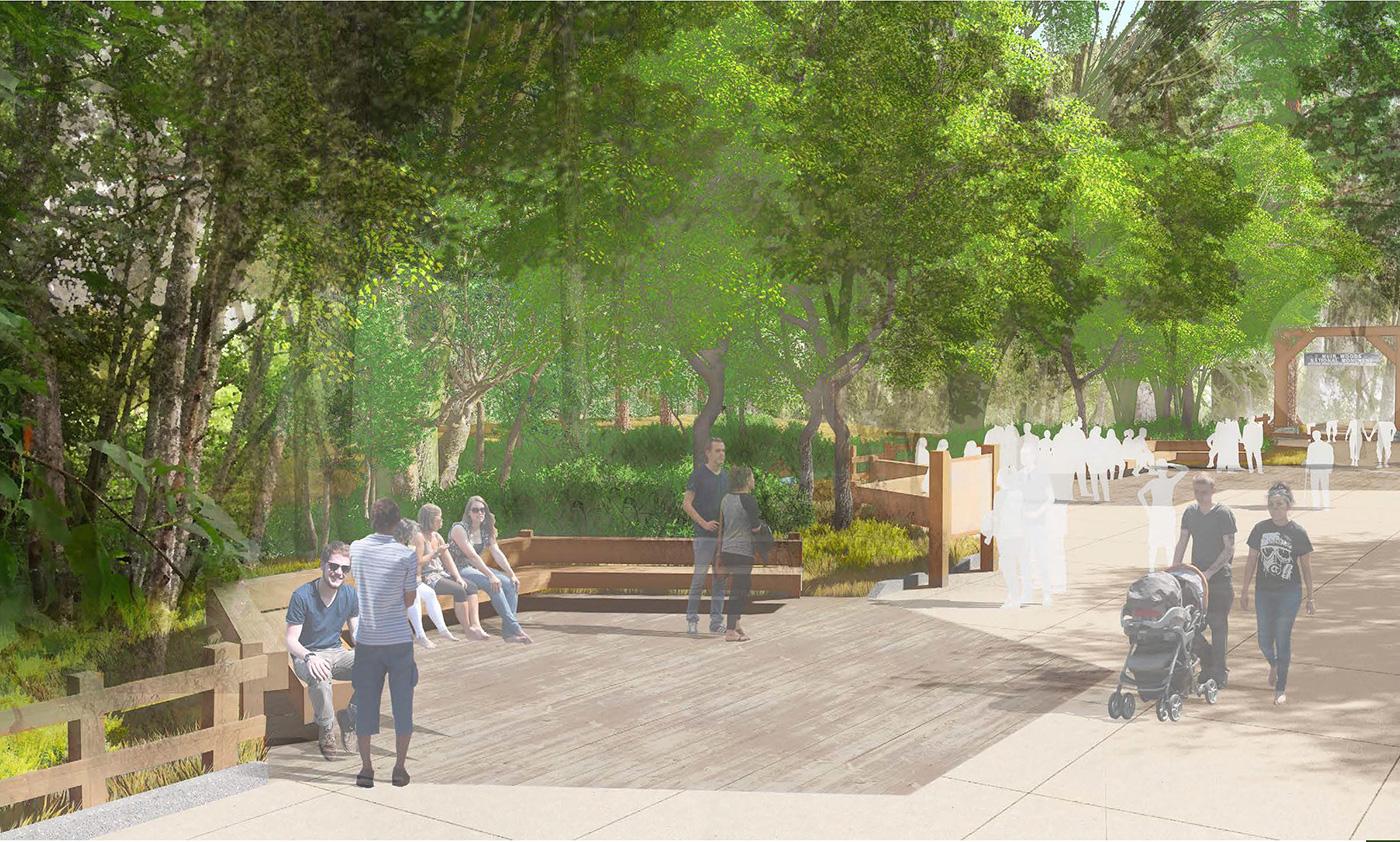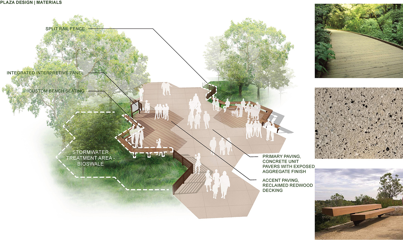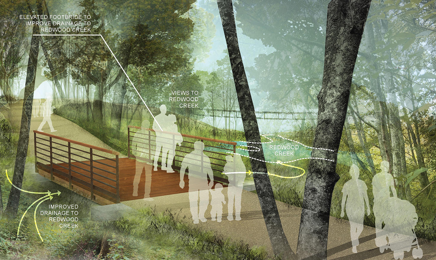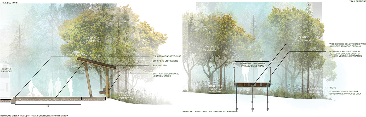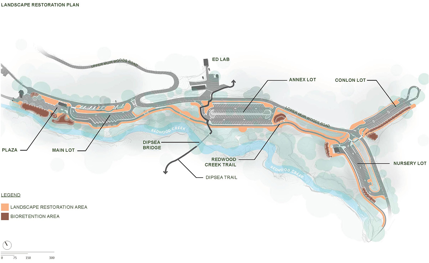 Design Workshop’s team of experts created a new sustainable access plan that would help alleviate growing pressures on the natural environment. By redesigning visitor amenities, pedestrian paths, and parking areas, the plan works to enhance natural resource protection at the park. A key opportunity for improvement was the entry plaza where the team created a design that welcomes visitors while integrating functional sustainable strategies. The new plaza will incorporate low-impact stormwater runoff collection and treatment, integrate reclaimed redwood planking to reduce erosion, and create natural boundaries to prevent disturbance of nearby vegetation. Not only will the integration of the plan enhance the visitor experience, it will also help protect Muir Woods for future generations.