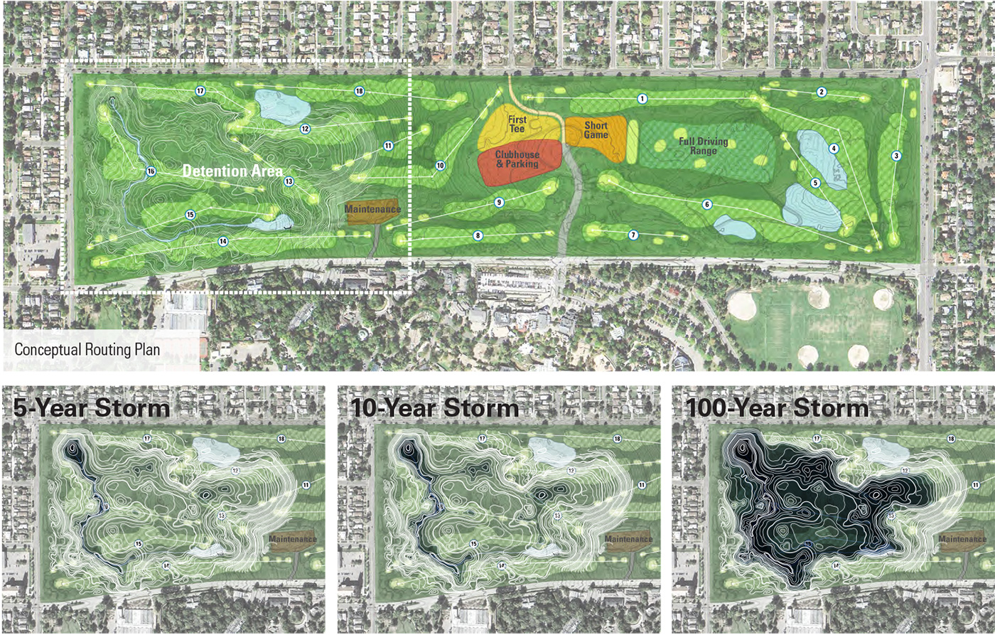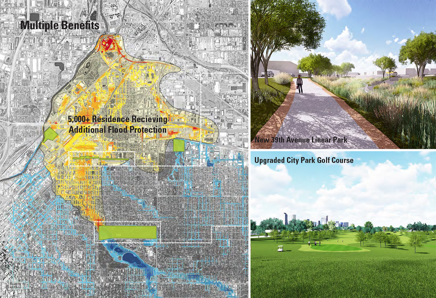 Rather than tearing homes down to manage the major flooding issues, an innovative process was implemented. Using the entire city as a canvas, a multi-tiered intervention strategy was used with four distinct projects throughout the city working in concert to capture and redirect stormwater. Primarily using vacant parcels and existing city properties, such as the historic City Park Golf Course, the basin’s former drainage capacity is restored while minimizing impacts to residences and businesses. The result is additional flood protection for over 5,000 residences, upgrades to existing City facilities and over 14 acres of new parks and open space in underserved communities.