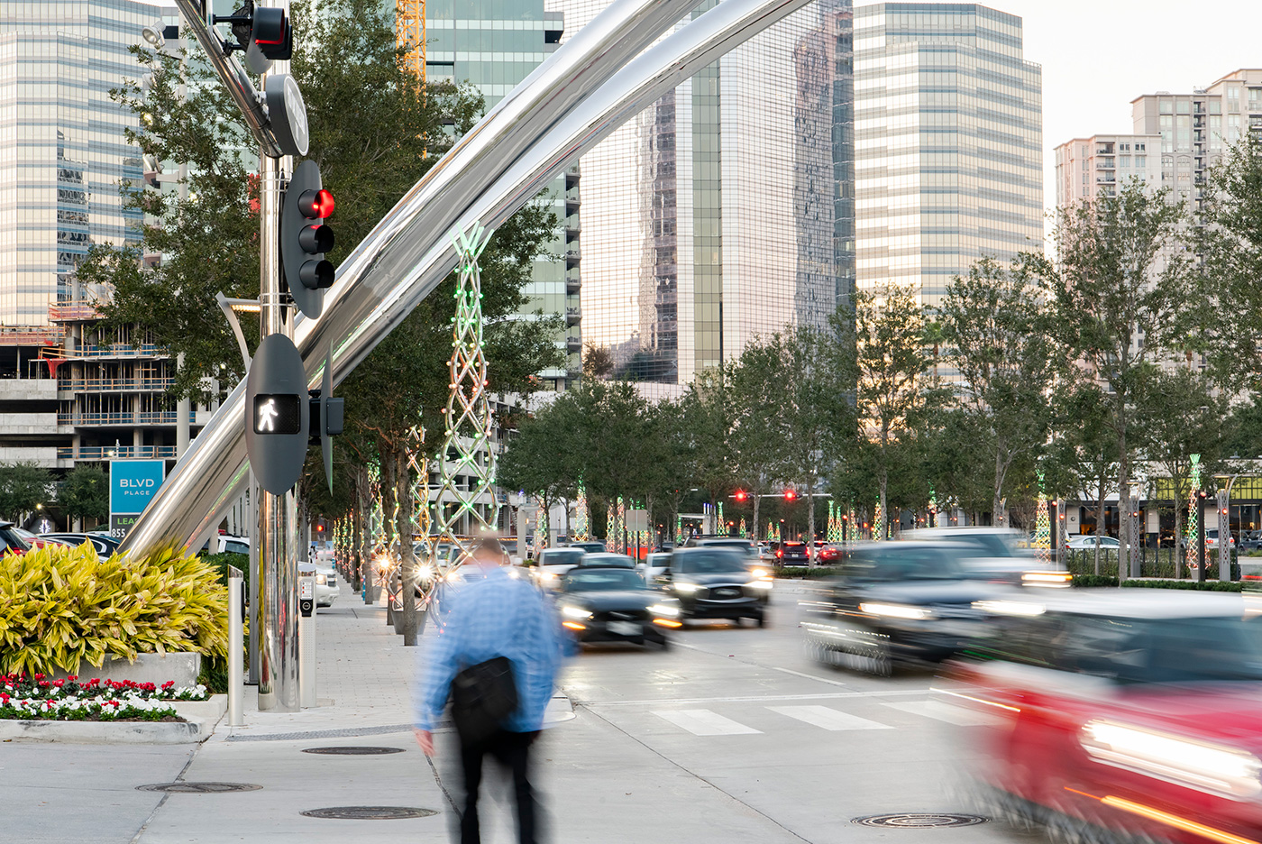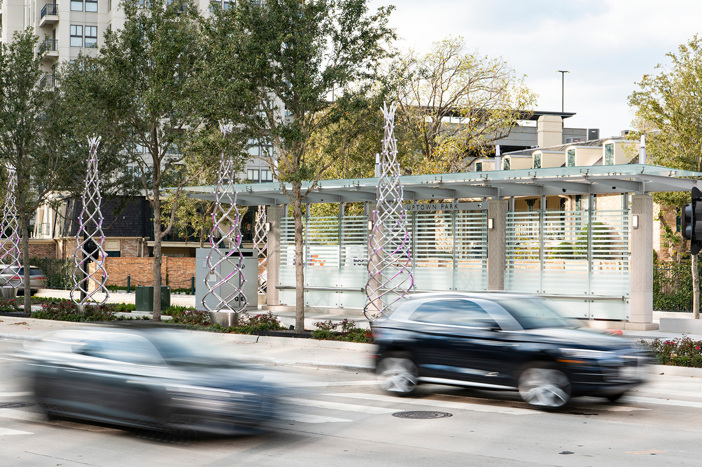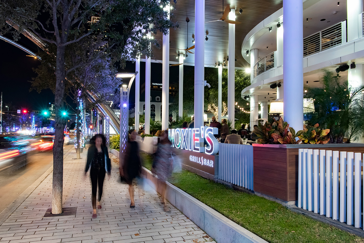 The boulevard is now home to nearly 1,000 live Oak trees and includes wider sidewalks, iconic pedestrian level lighting and signature placemaking elements throughout the district. These incremental moves have been designed in a careful concerted effort to realize the vision of a complete community. A new public realm, canopy, artful landscape finishes, and a BRT system knit the neighborhood together. These bold moves provide a strong sense of neighborhood identity and transit connections to the larger Houston area. This Grand Boulevard ushers in the next chapter of Uptown, Houston as a complete community.