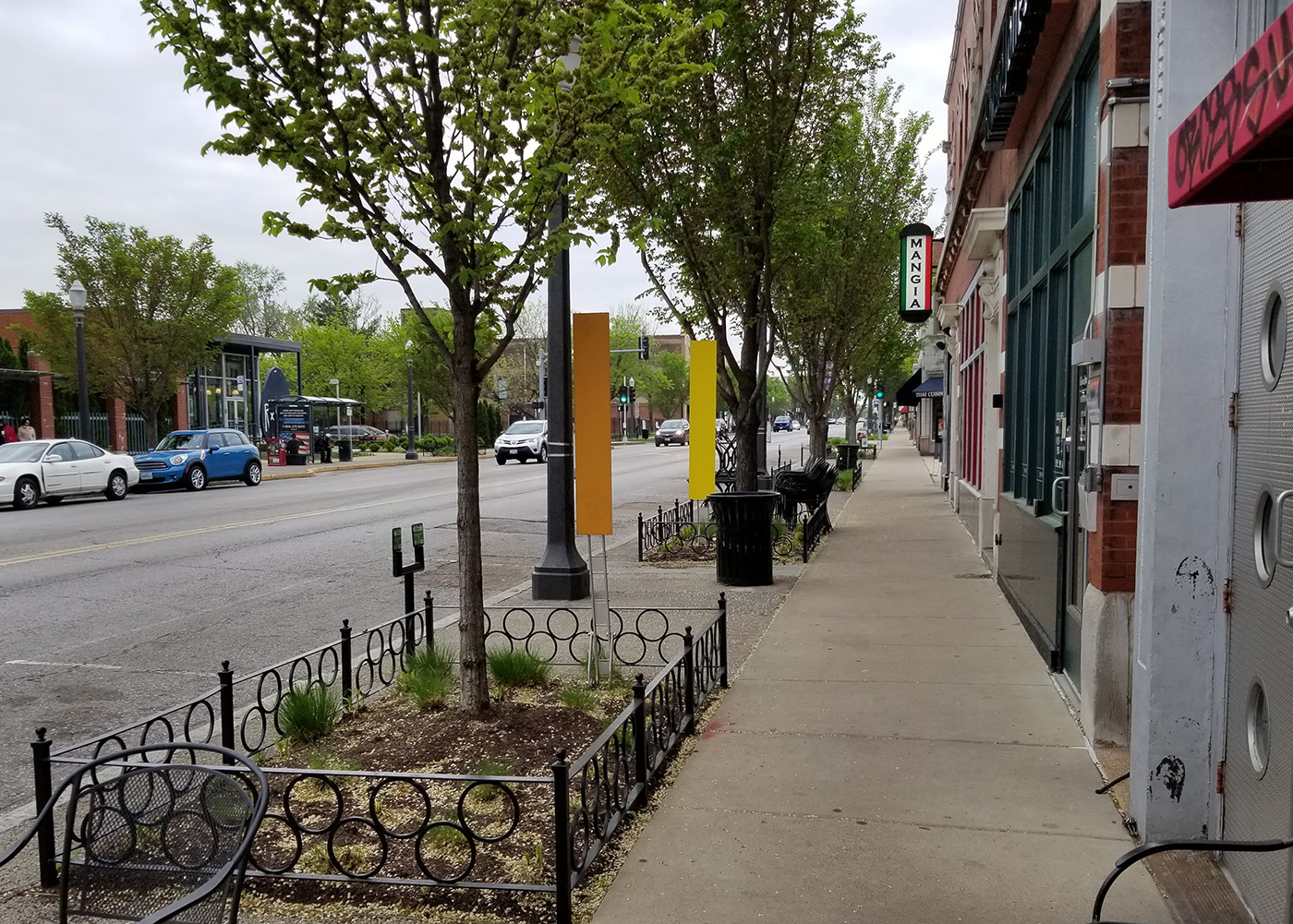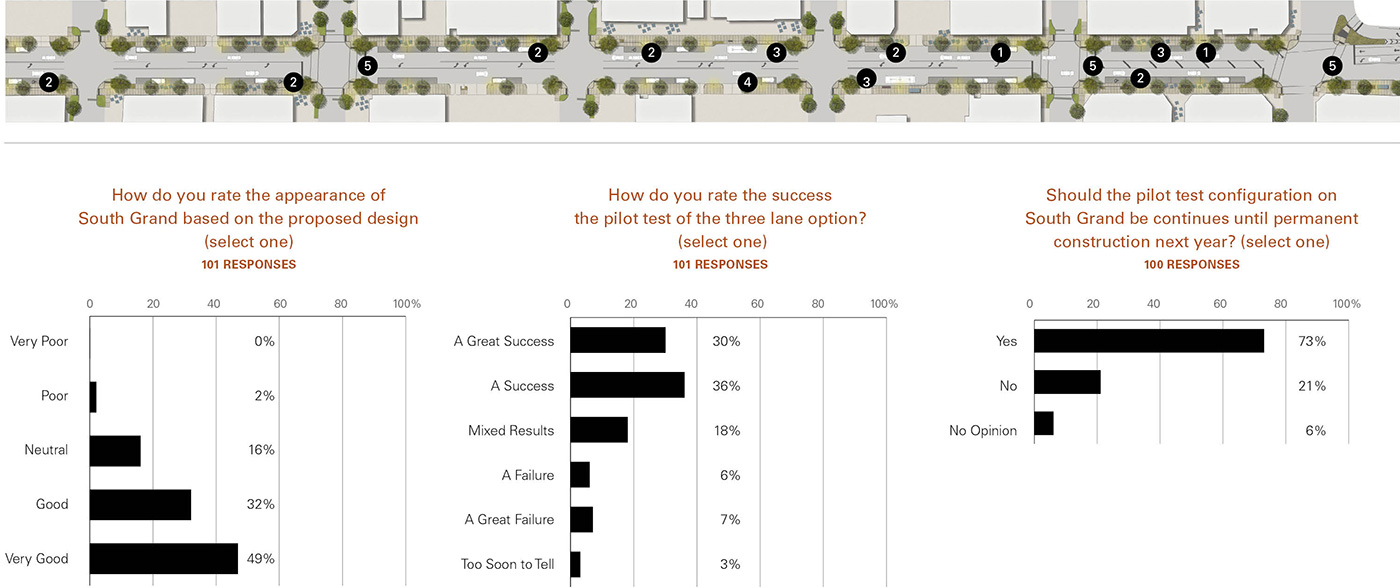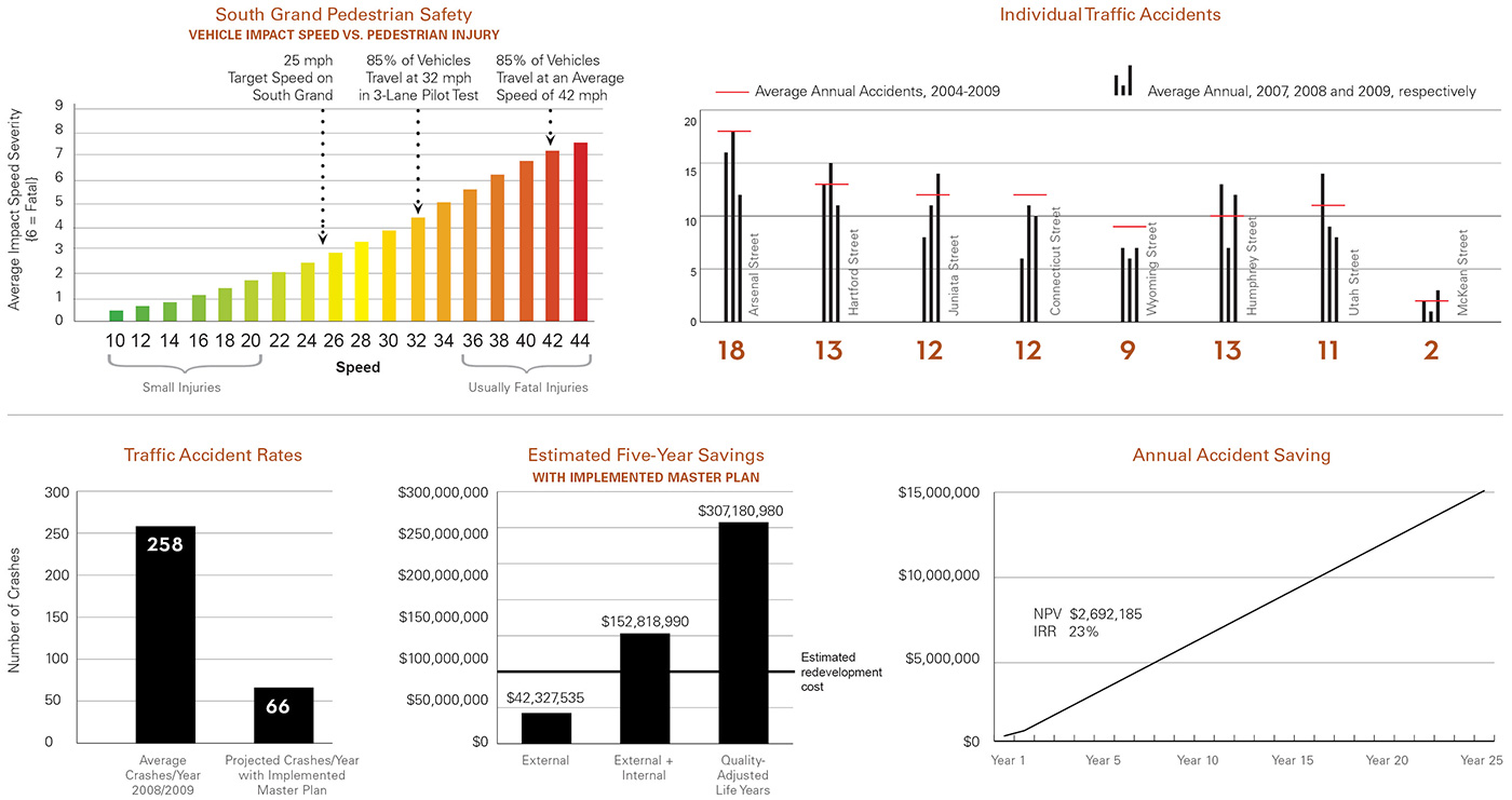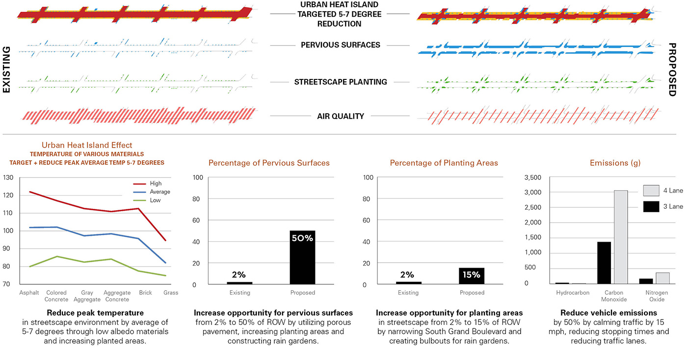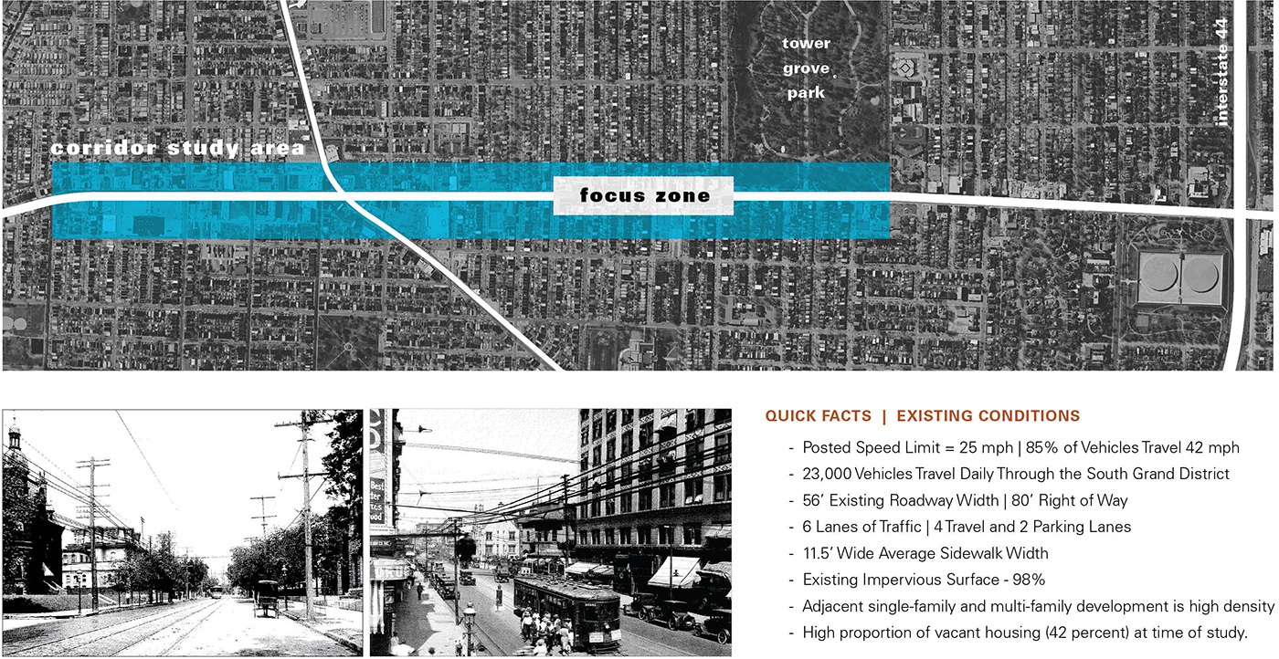 Selected as one of four Great Streets Initiative pilot projects in 2009, the South Grand redevelopment transformed a six-block corridor into a vibrant destination, improving the pedestrian experience, enhancing safety and providing opportunities for continued economic development. The streetscape enhancement project featured extensive community involvement. The designers analyzed these options using 40 metrics that addressed environmental, social, economic and aesthetic considerations. The final boulevard design enhances walkability, incorporates innovative stormwater management and creates a memorable public realm which builds on the character of the community.