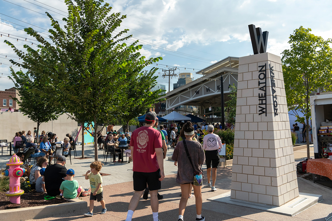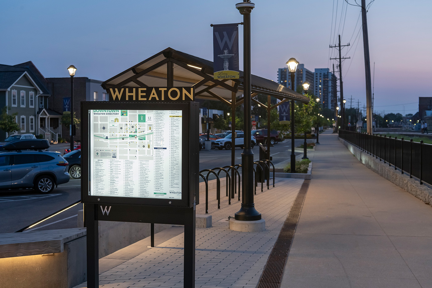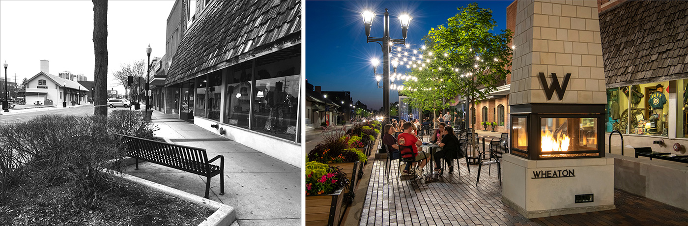 As the first implemented project of the Downtown and Strategic Streetscape plan, Design Workshop ensured that the design process for Front Street considered both the cost of construction as well as the cost of maintenance and life cycle. Our process qualified various material alternatives for paving, curbs, crosswalks, wayfinding, furnishings, site lighting, planting methods and street tree treatments. Adjacent to the railroad tracks that parallel Front Street is the Illinois Prairie Path which has eight hundred thousand annual visitors. A new plaza is strategically located to encourage Prairie Path users to visit downtown. Now called “Wheaton Promenade,” this space was designed to serve as a central gathering place, flexible in its composition to accommodate soft programming, yet firm in its design to allow it to serve as a gathering space in all seasons. Anchored by an iconic fireplace with the Wheaton ‘W’ front and center, surrounded by flexible café seating, the plaza is defined by its catenary lighting, custom rail system of planters, rich materials, and a custom water feature. Wayfinding signage guides visitors, while the new multi-purpose canopy and the branded obelisk identify and anchor the new area. The design redefines public gathering space within the downtown where limited gathering space existed.
